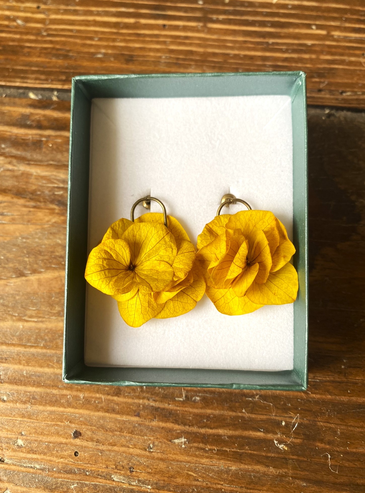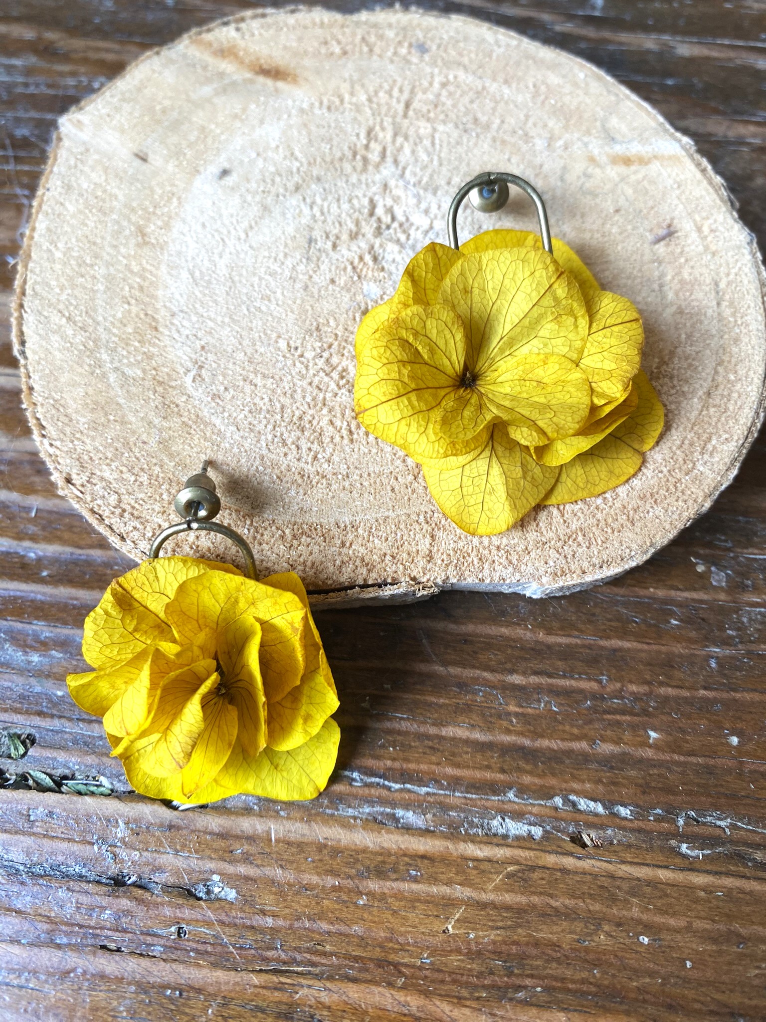 Ces boucles d’oreilles seront parfaites pour égayer votre tenue en soirée, pour votre mariage. A offrir ou à vous offrir ! Les fleurons d’hortensia jaune sont montés sur des clous, vous pouvez choisir la couleur : doré ou bronze.